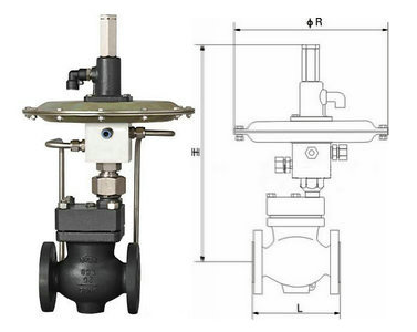 該閥采用大膜片執(zhí)行機(jī)構(gòu)輸出力大穩(wěn)定,對壓力流量微小變化極其敏感,控制精度很高,閥芯采用單座流開(高進(jìn)低出)設(shè)計,在閥蓋處(和閥體連接處)安裝有平衡膜片(起到閥前壓力平衡,消除不平衡力)閥后壓力經(jīng)取壓管進(jìn)入薄膜執(zhí)行機(jī)構(gòu),同薄膜執(zhí)行機(jī)構(gòu)調(diào)節(jié)彈簧相比較,壓力達(dá)不到設(shè)定值(調(diào)節(jié)壓縮執(zhí)行機(jī)構(gòu)彈簧)閥后壓力則變大,反之則變小。